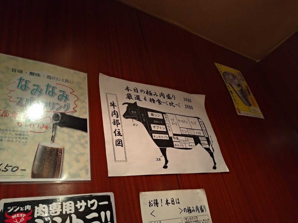 我々の隣には、キャバ嬢と同伴っぽいサラリーマン風の男性が壁にあるポスターを見ながら部位に関してのうんちくを語っている、そんな微笑ましい中、美味しいお肉を堪能しました。
